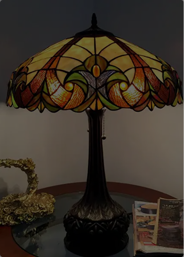 An elegant antique lamp featuring a beautifully patinated brass base and a hand-crafted stained glass shade, radiating timeless charm and warmth. Perfect for adding vintage sophistication to any space.